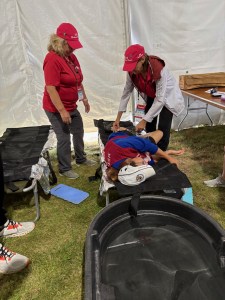 “OK, alright, ice brigade!” Landry calls out to the medical volunteers. They line up outside the tent to grab bags of ice from a truck and drop two next to each tub.