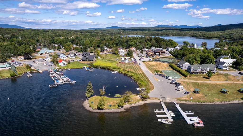Boats docked at the new boat ramp, bottom right, at Town Cove Park in Rangeley. (Russ Dillingham/Staff Photographer)