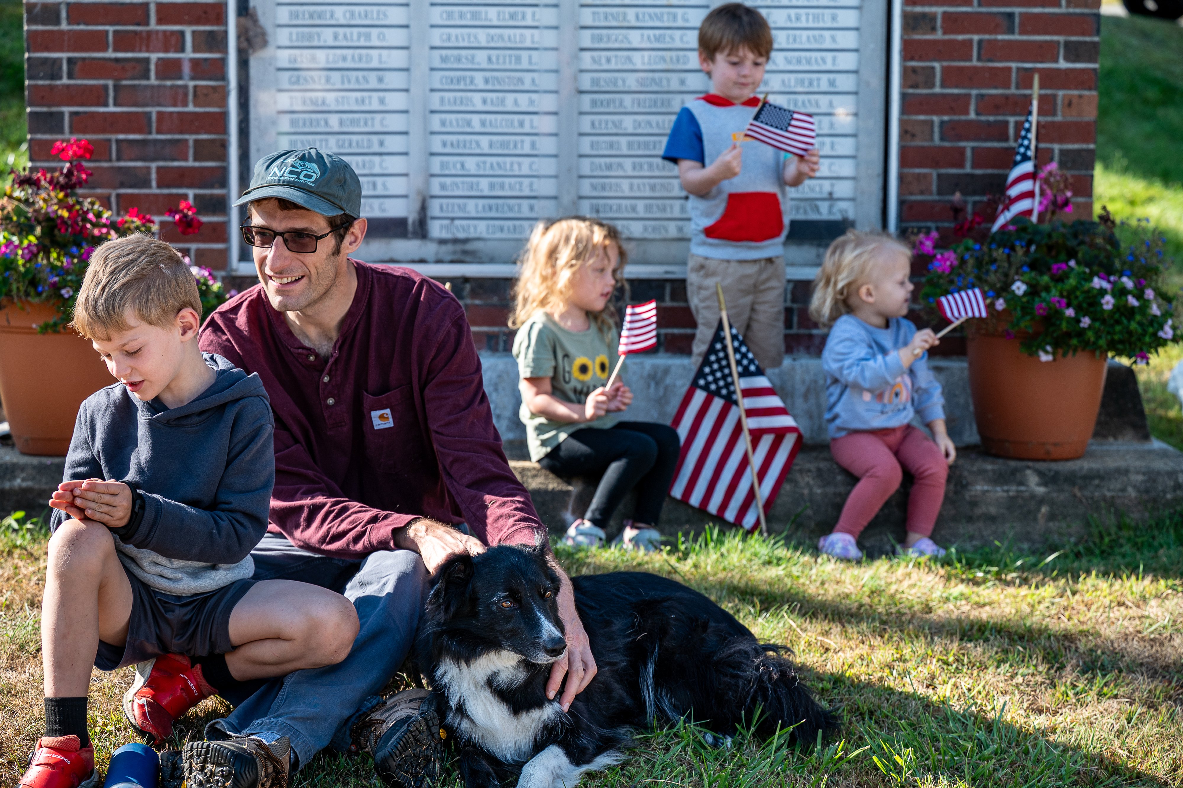 John Matulis, his son Frankie, and dog Sweetie sit on the lawn Sept. 1 in front of the Zadoc Long Free Library as they wait for the start of the annual Labor Day Parade in Buckfield. (Russ Dillingham/Staff Photographer)