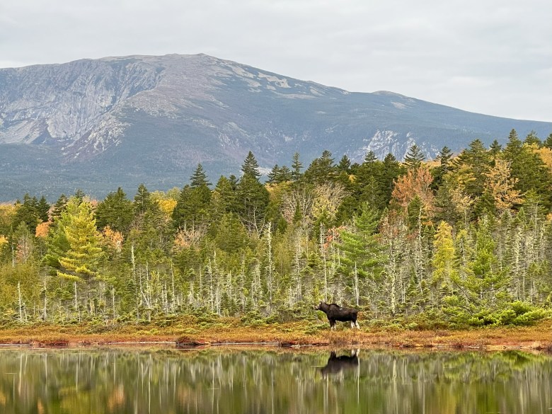 We stand in awe, quiet but for the frenzied movement of fingers on cameras and the occasional muttering of thanks for the good fortune to witness this incredible moment. Before the performance ends, a cow moose wanders into the picture, Katahdin as backdrop. Perfect.