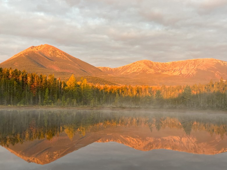 Minutes later, the sun breaks over the treetops and slowly but surely bathes Katahdin in pastel pink. First the summits of South Peak and Pamola and the jagged Knife Edge. Then Hamlin Peak and Howe Peak, the Saddle, and the walls of the Great Basin and North Basin. The light turns orange, the trees at the pond’s margin appearing as if in flames.