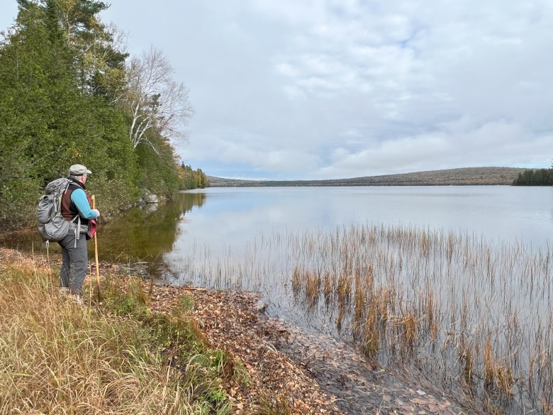 Our return to Martin Ponds leads along the sandy Katahdin Lake shoreline, which rewards us with views west to the Katahdin massif and to South and North Turner mountains. It is a fine amble back, partly on an old tote road and the last stretch on a forest footpath. Close to the shelter, we gather up a good bundle of dry kindling and sticks.