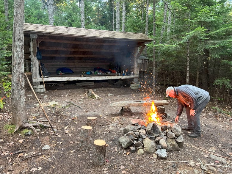 The evening is a relaxing affair: multiple forays to the pond to enjoy the grand Katahdin view, a warming blaze against the gathering fall chill, a hot meal of freeze-dried something or other.