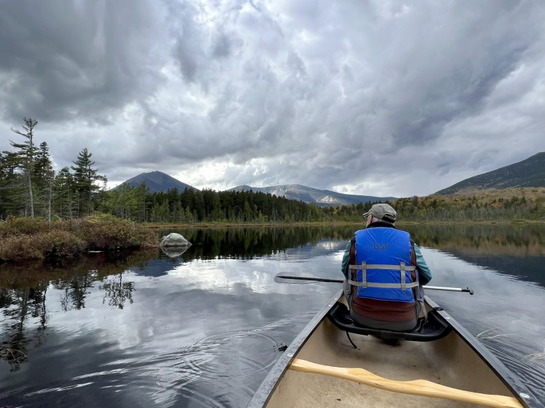 Bellies full, we grab the canoe and slide it into the water. It takes but 15 minutes to paddle around Martin Pond, but we require a full 45 minutes, slowly paddling (or not) to explore every nook and cranny of the shoreline, hoping perhaps for another moose sighting. And admiring, ever out there to our south, the impressive bulk of Maine’s “Greatest Mountain.”