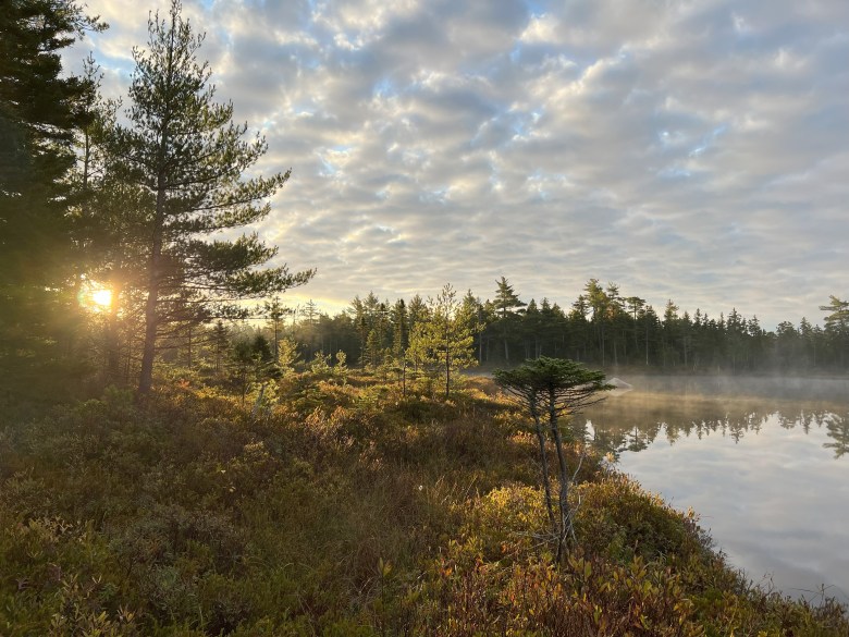 First light, 6:15 a.m. Bleary-eyed, I roll onto one elbow. Beyond the outline of the shelter opening, I can just see the mountain. Three weeks into autumn, it’s cold, so I don a fleece and puffy jacket. Out of the warm bag, I crawl and pull on pants and boots. With camera in hand, I head for the pond shore, 150 feet away. Coffee will have to wait.