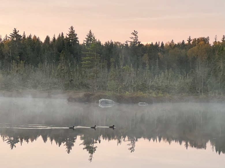 I’ve seen the photos from this very spot. And I’ve waited for the chance to experience the scene for myself. Two previous rainy visits were a bust, but now I stand at the ready and watch, hopeful that the conditions will allow the much anticipated show. My hiking buddy awakens from his slumber and joins me. Three mergansers stealthily glide past.