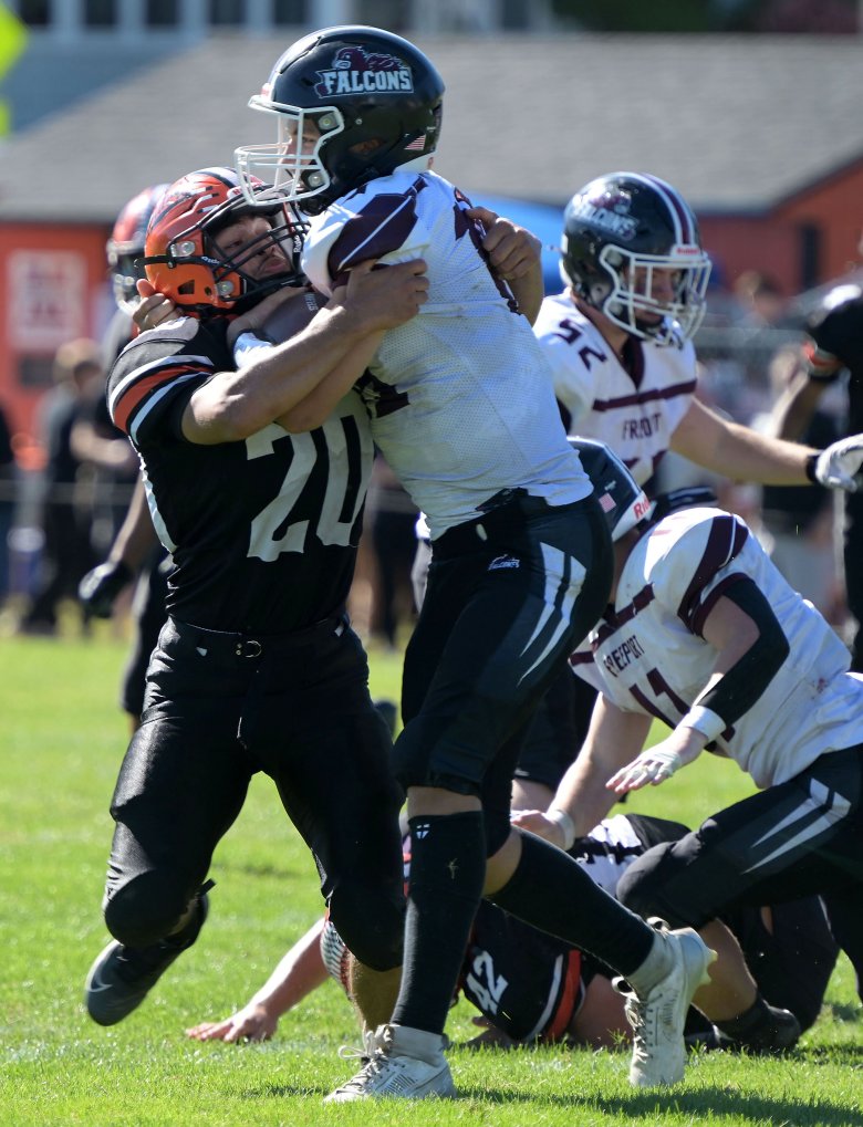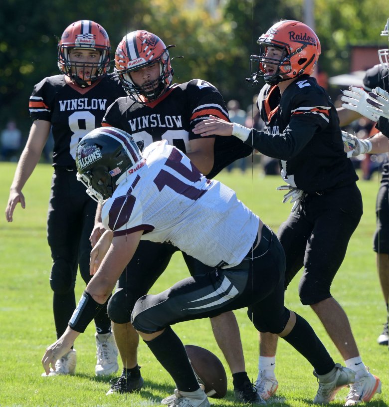 • Winslow’s defense made plays, too. The Black Raiders were prepared for Freeport’s Andrew Thomas to throw and held him to 4 of 14 passing for 56 yards, one touchdown and an interception that Broddik Bimpson returned for a score. The Falcons (2-1) rushed for just 90 yards.