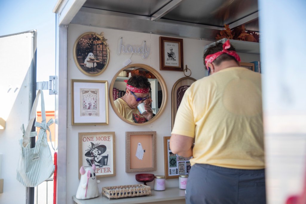 At 10 a.m. sharp, a Sabrina Carpenter song started playing inside the trailer from a speaker hidden behind a canister of bookmarks. Displayed on the same side table were book-themed candles, a red coupe glass filled with Kindle charms and a basket of stickers. Fake leaves and pumpkins lined the tops of the bookshelves along the walls.