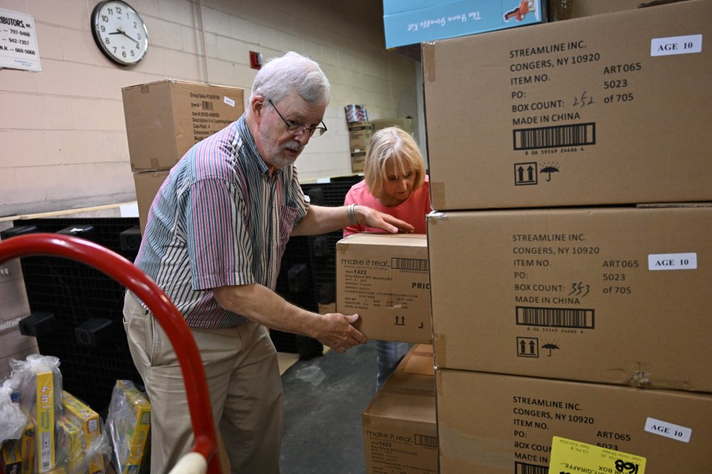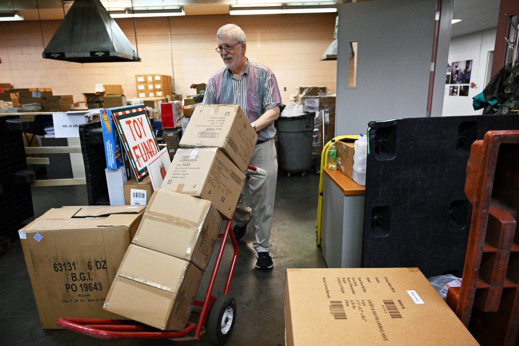 More than 30 volunteers will help unbox, sort, pack and distribute gifts in the coming weeks. Janet Edmunson, of South Portland, pushed a dolly of boxes through the workshop on Wednesday afternoon. She’s been coming back for years because she knows these families don’t have other options at the holidays.