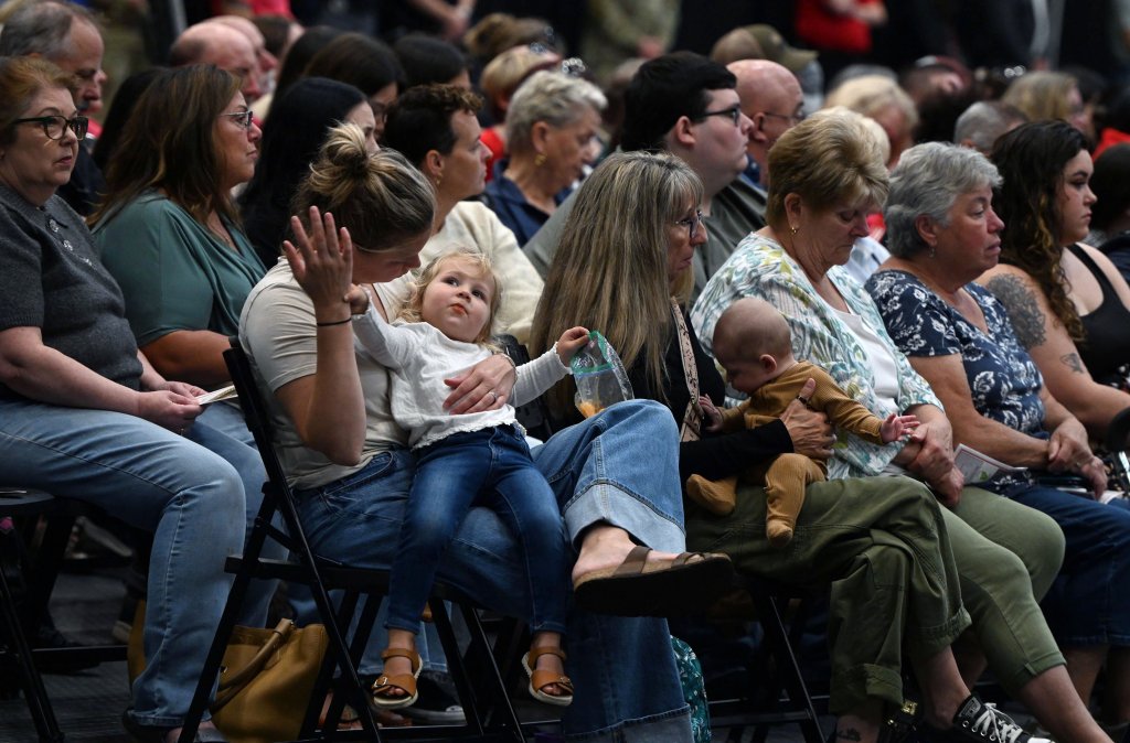 Maine Gov. Janet Mills speaks Friday during a send off ceremony for members of the 136th Engineer Vertical Construction Company of the Maine Army National Guard at the Augusta Civic Center in Augusta.Mariah Cornelison of Harpswell holds her daughter Berit Cornelison, 2, during a sendoff ceremony Friday for the girl’s father, Sgt. Robert Cornelison, and 130 other members of the 136th Engineer Vertical Construction Company of the Maine Army National Guard at the Augusta Civic Center in Augusta. The unit is split between Lewiston and Skowhegan.Members of the 136th Engineer Vertical Construction Company of the Maine Army National Guard stand at attention Friday as family members and friends photograph and watch the start of a sendoff ceremony at the Augusta Civic Center in Augusta.Sgt. TJ Johanson, a member of the Maine Army National Guard 136th Engineer Vertical Construction Company, holds his son Odin Johanson, 3, of Wales, at the close of a sendoff ceremony for the unit Friday at the Augusta Civic Center in Augusta. Also shown is TJ Johanson’s son Isaiah LaBrecque, 9, left, and Johanson’s mother-in-law, Sara LaBrecque, at the right. The 130-member unit is being deployed to Saudi Arabia. The unit, which is split between Lewiston and Skowhegan, will support Operation Spartan Shield with construction, electrical work, masonry and various other mission-focused capabilities.Members of the 136th Engineer Vertical Construction Company of the Maine Army National Guard stand at attention Friday as family members and friends photograph and watch a send-off ceremony at the Augusta Civic Center in Augusta.