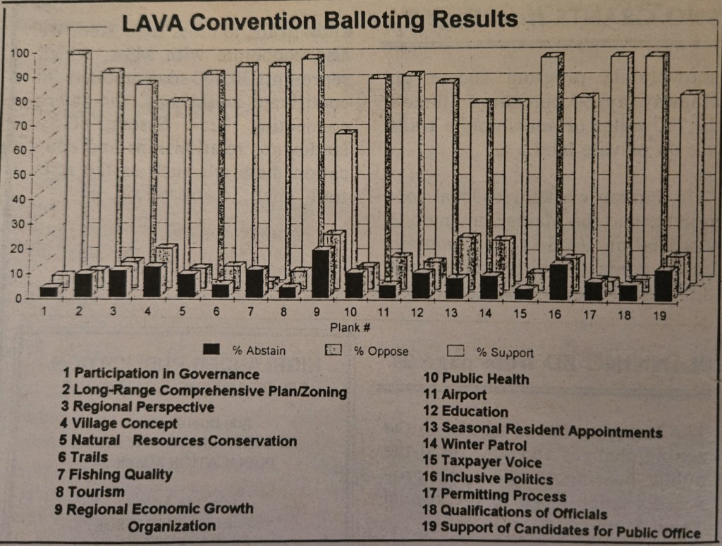 At the Feb. 22, 1995, convention, each plank was voted on by secret ballot. According to an article in the March 3, 1995, edition of The Rangeley Highlander, about 125 people gathered to consider 19 planks “that organizers feel can provide a cohesive vision for the future of the Rangeley Region.”