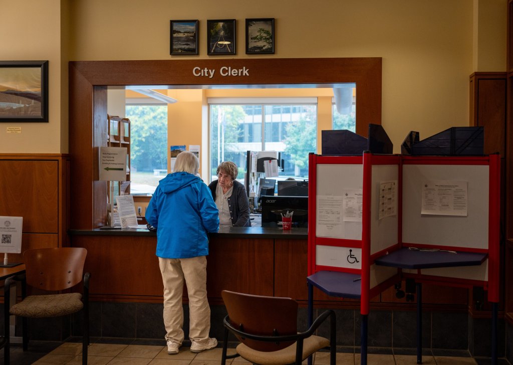 Shirley Rabasco picks up her ballot from Assistant City Clerk Jolene Girouard at Auburn City Hall in October 2024. (Andree Kehn/Staff photographer)