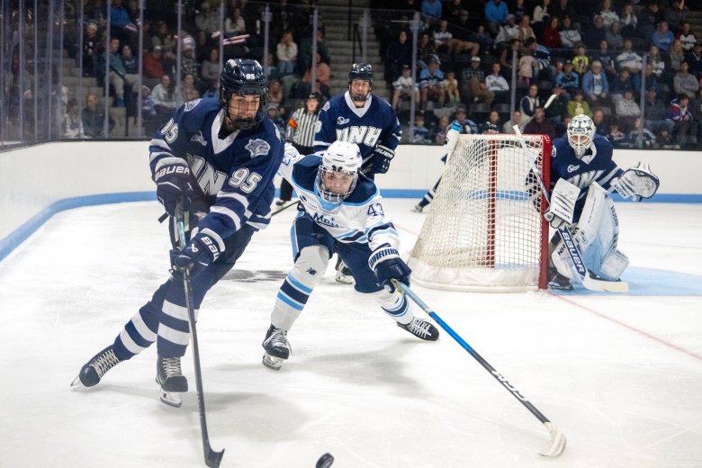 One of the newcomers, defenseman Simon Motew, scored Maine’s first goal at 18:11 of the second period. Motew took a hard shot from the point, and it rang off the inside of the right post as it went in, shortly after the Wildcats took a 2-0 lead.