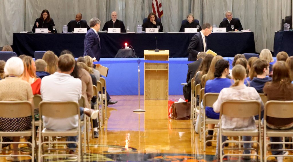 The ACLU and the state argued their sides in front of about 100 students and staff in the Upper Kennebec Valley High School gym, as part of the high court’s yearly tour of Maine schools.