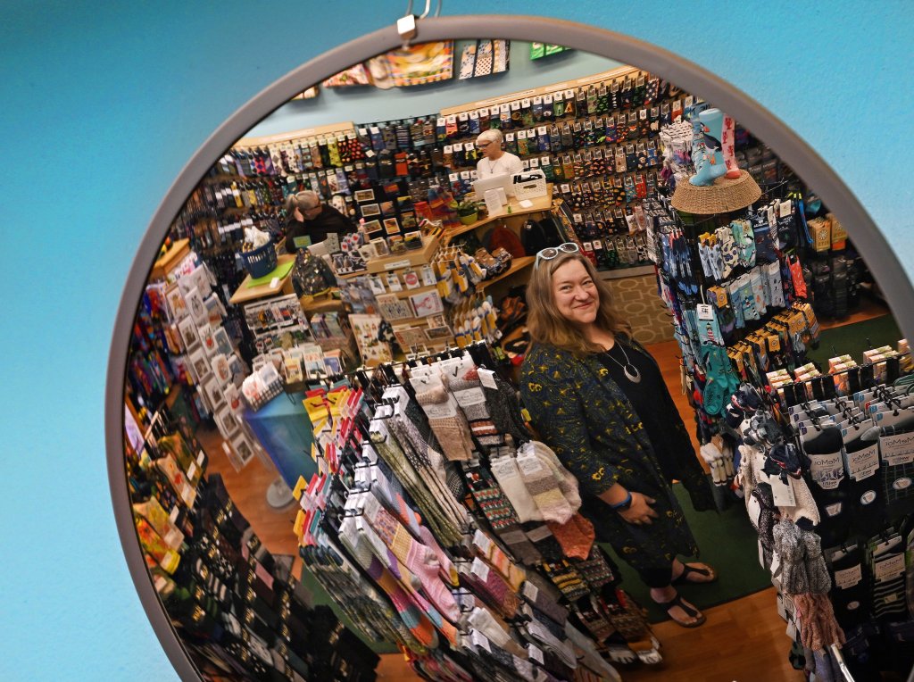 Hildi McKeagney, owner of The Sock Shack reflected in a mirror at her shop in Portland in early October. (Shawn Patrick Ouellette/Staff Photographer)