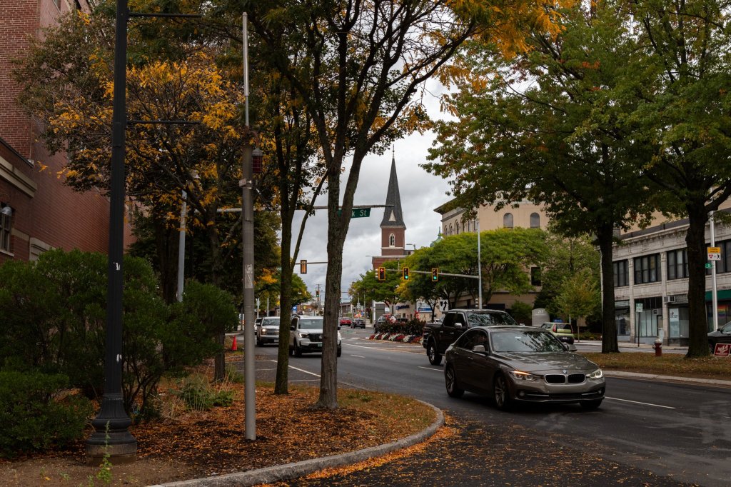 The steeple of the former St. Joseph’s Church in Lewiston is seen Wednesday through trees, some losing their leaves in the wind. The day before, temperatures reached 81 degrees, compared to the 59 degrees recorded by the National Weather Service just before 2 p.m. Wednesday. A freeze watch was issued for Thursday night, with temperatures expected to dip as low as 29 degrees. (Libby Kamrowski Kenny/Staff Photographer)