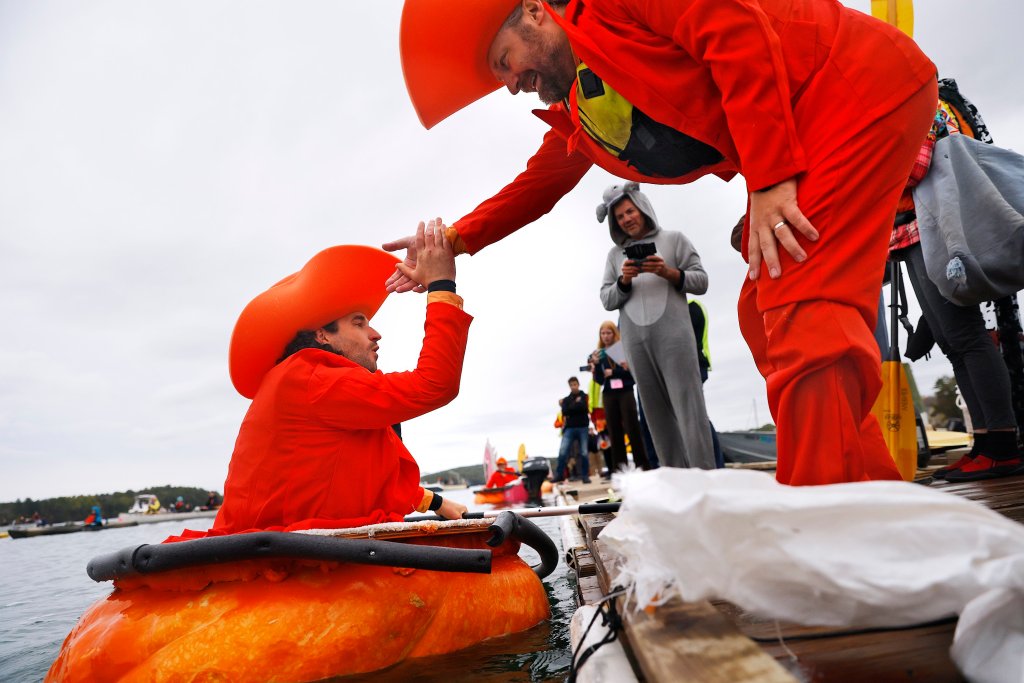 For his first time competing in the Damariscotta pumpkin regatta, Ball paddled his pumpkin decked out as the “Red Baron” plane from the “Peanuts” comics while dressed as the character Linus. His aunt, Jaja Martin of Bremen, wore a Snoopy costume and has participated in the regatta for over 15 years.