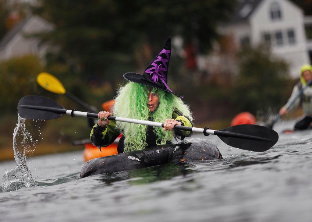 Bean Andrenyak has paddled in the regatta for 10 years. She has dressed as a lobster, butterfly and disco queen with hollowed-out gourds decorated to match. This year, she competed as a witch with a curly green wig and pumpkin boat painted black like a cauldron.