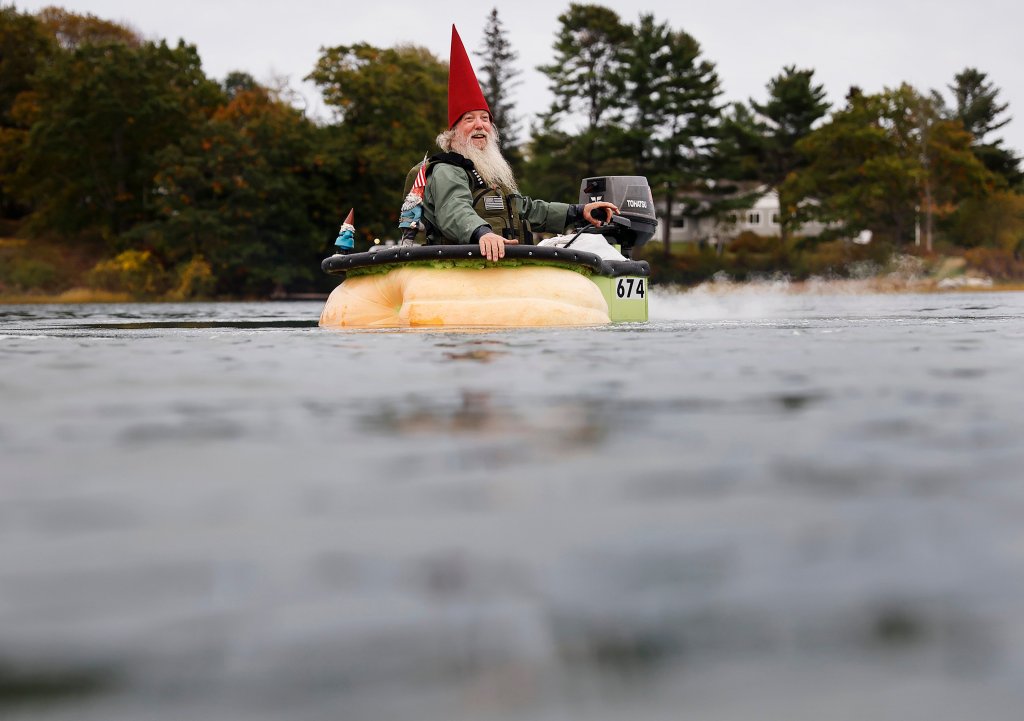 Over the years, one pumpkin regatta contestant in particular has made his mark with a red pointed hat. Tom Lishness competes in the motorized pumpkin boat race year after year dressed as a gnome.
