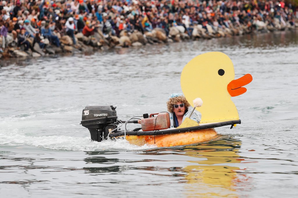 Some pumpkin boats were painted as silver pots of soup complete with vegetables, the green horse of “Pumpkinhead Pete” and a pink pony, with contestants costumed as chefs, Shrek, a banana and a loon.