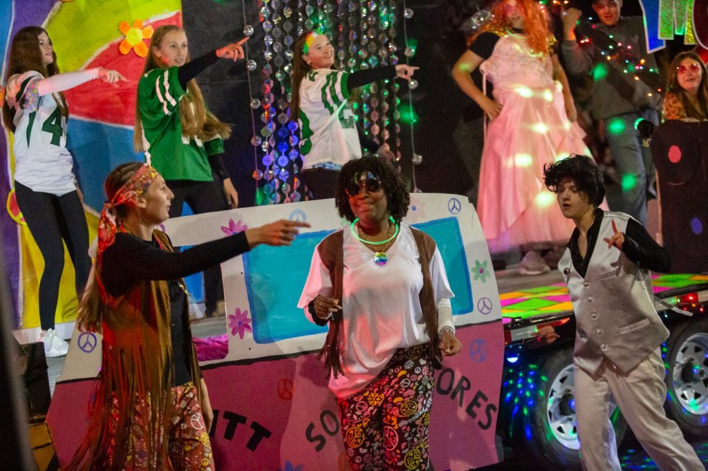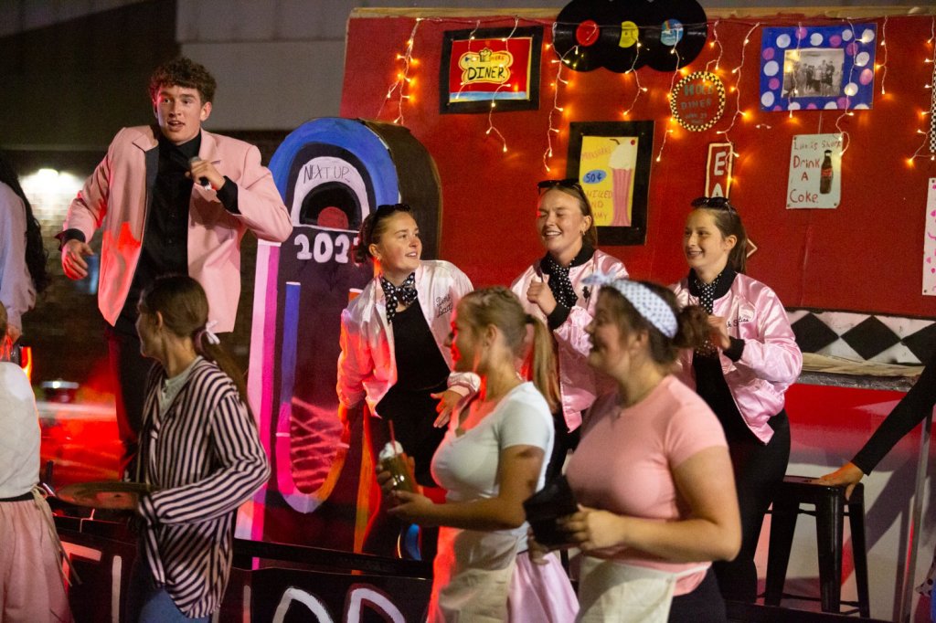 Juniors perform the Twist on its 1950s-themed float winning first place in the contest.