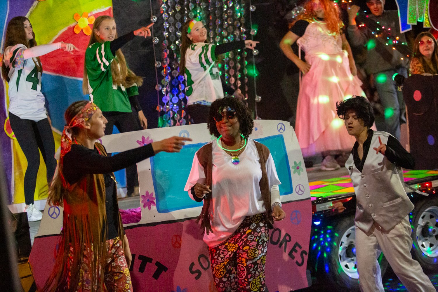 Leavitt Area High School sophomore Korina Gordon performs front and center of the sophomore class float Saturday during Leavitt's homecoming parade in Turner. Each class assembled a float themed around a decade — the sophomores represented the 1970s — complete with decorations, music and choreographed routines performed during halftime at the Leavitt-Gardiner football game. (Libby Kamrowski Kenny/Staff Photographer)