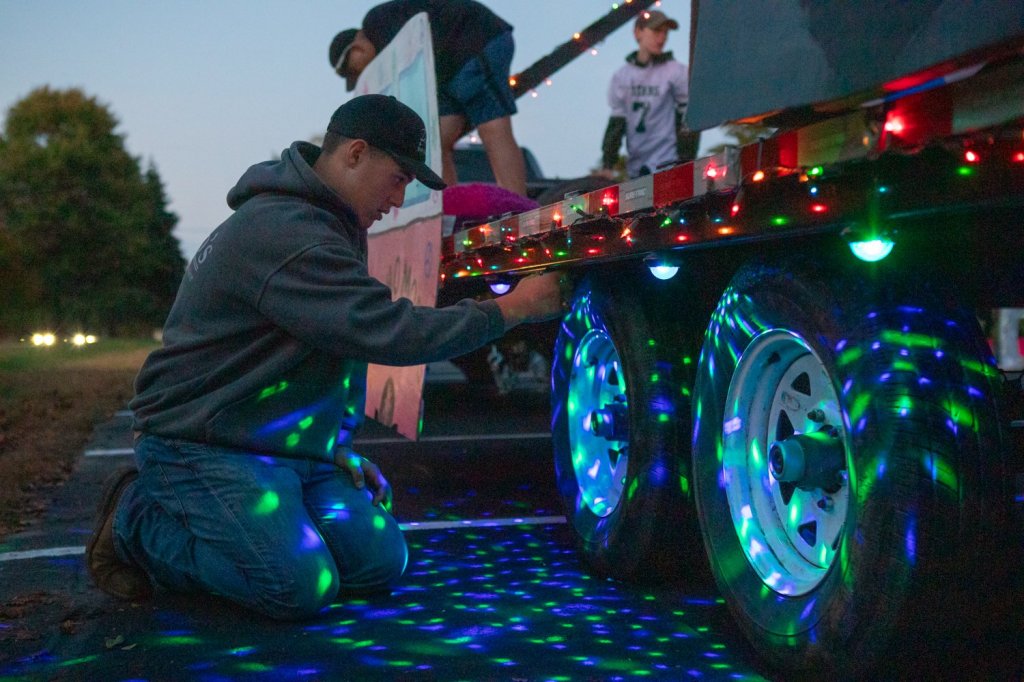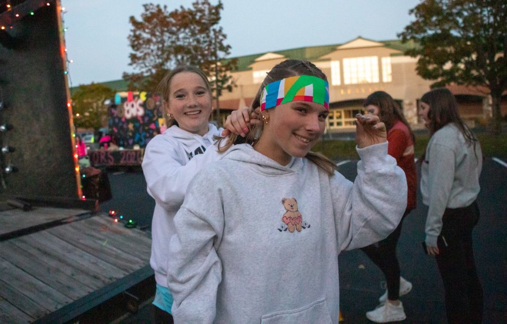 Leavitt Area High School seniors perform at a homecoming parade during halftime of the Leavitt-Gardiner football game Saturday in Turner. The classes each assembled a float themed around a decade — the seniors represented the 1980s — complete with decorations, music and coordinated dance routines that were performed in a parade during halftime on the school grounds. (Libby Kamrowski Kenny/Staff Photographer)Leavitt Area High School freshman Chloe Bouthot performs as Napolean Dynamite during Leavitt’s homecoming parade Saturday in Turner.(Libby Kamrowski Kenny/Staff Photographer)Leavitt Area High School juniors dance the Twist on their 1950s-themed float during Leavitt’s homecoming parade Saturday in Turner. The juniors won first place in the float contest. (Libby Kamrowski Kenny/Staff Photographer)Leavitt Area High School seniors, from left, Trent Warden, Gabby Smith, Jada Beedy, Lydia McLean and Sabrina Sajorzoda rehearse a dance routine before Leavitt’s homecoming football game against Gardiner Saturday. (Libby Kamrowski Kenny/Staff Photographer)Leavitt Area High School freshman Elyvia LaChance secures decorations on her class’s 2000s-themed float with masking tape before Leavitt’s homecoming football game against Gardiner Saturday. (Libby Kamrowski Kenny/Staff Photographer)Leavitt Area High School sophomore Brylee Emmons, left, helps Lena LaRoche tie a bandana on as part of her class’s 1970s-themed costumes before Leavitt’s homecoming football game against Gardiner Saturday in Turner. (Libby Kamrowski Kenny/Staff Photographer)Leavitt Area High School sophomore Jared Dunnington puts the finishing touches on his class’s float with colored lights before Leavitt’s homecoming football game against Gardiner Saturday in Turner. (Libby Kamrowski Kenny/Staff Photographer)Leavitt Area High School sophomore Korina Gordon performs front and center of the sophomore class float Saturday during Leavitt’s homecoming parade in Turner. The sophomore class represented the 1970s — complete with decorations, music and choreographed routines performed during halftime at the Leavitt-Gardiner football game. (Libby Kamrowski Kenny/Staff Photographer)