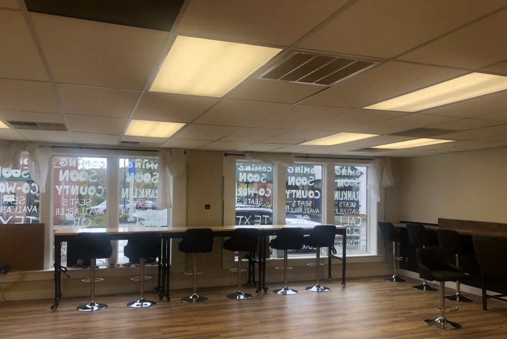 Franklin County Co-Working will offer daily and monthly coworking seats. A conference room and a music studio will be available to rent. Amenities include a coffee bar and fiber internet.