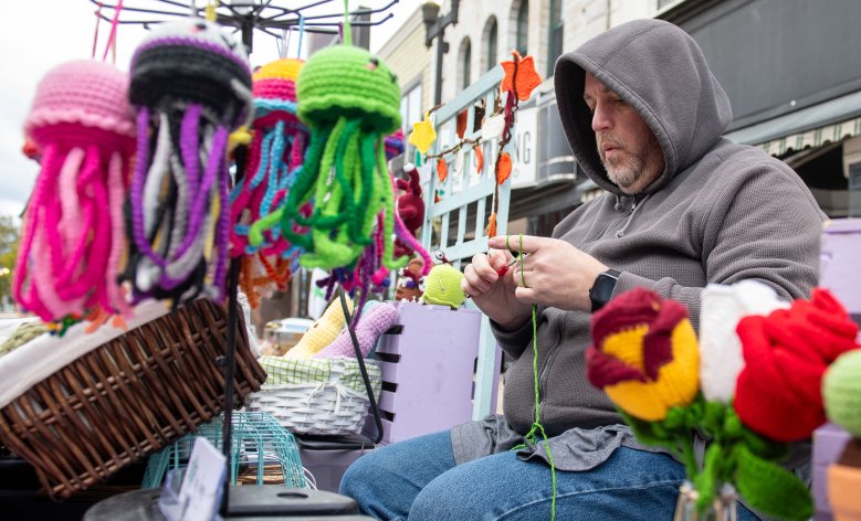 Joey T, from Stuff by Joey, crochets decorations during the Lewiston Auburn Metropolitan Chamber of Commerce's annual Taste the Harvest event in Lewiston. (Russ Dillingham/Staff Photographer)