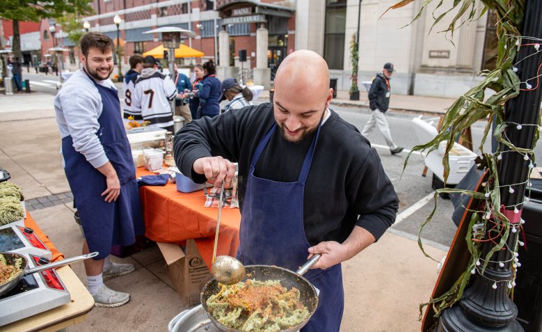 Evan Mancini, from Mancini's Italian Deli in Lewiston, prepares bolognese and ricotta pasta Wednesday on the sidewalk in front of Dufresne Plaza during the Lewiston Auburn Metropolitan Chamber of Commerce's annual Taste the Harvest event in Lewiston. Dozens of local restaurants, farms and vendors took part in the event that highlights and promotes the local food economy. (Russ Dillingham/Staff Photographer)