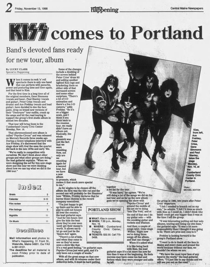 In a November 1998 interview with music reviewer Lucky Clark for Central Maine Newspapers, Frehley talked about an upcoming performance for KISS at the Cumberland County Civic Center in Portland. At the time, the original members of KISS had decided to reunite and once again don their iconic face paint and “Destroyer” tour outfits.