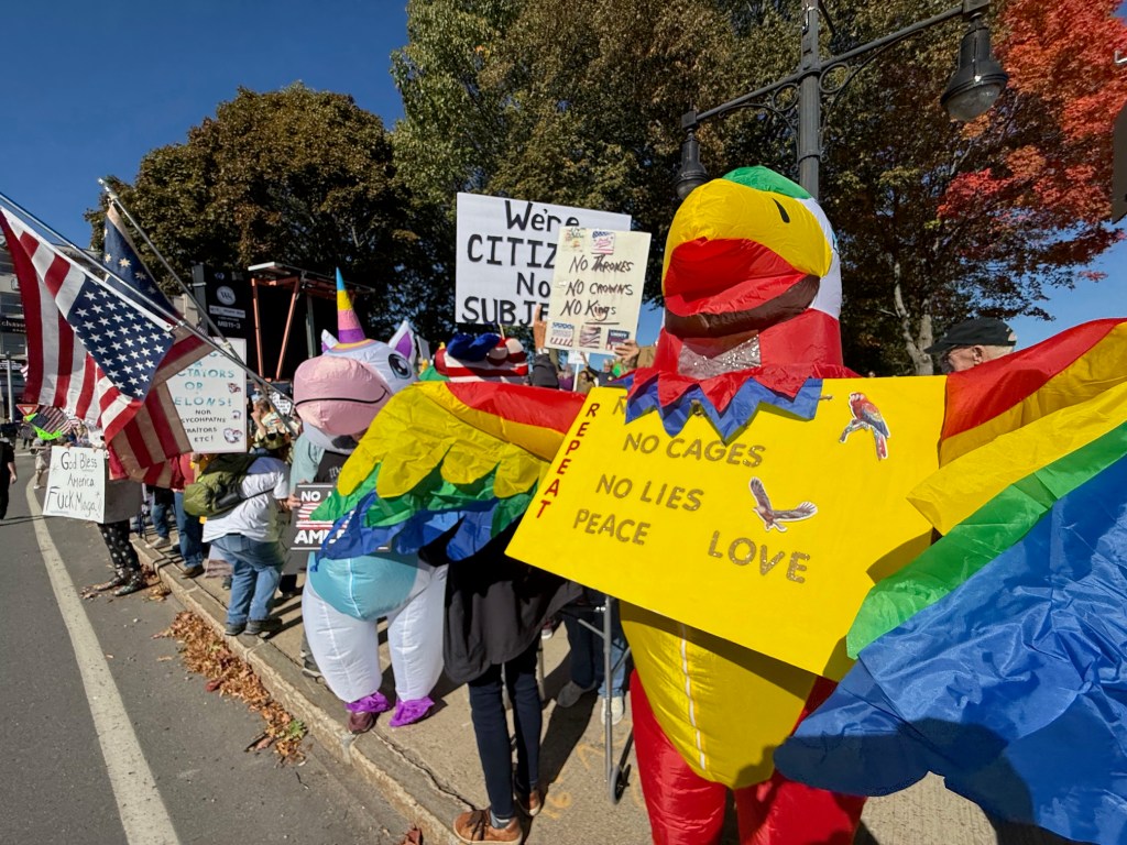 In Auburn on Saturday, the crowd grew quickly in anticipation of the noon start. Protesters carried homemade signs of all kinds, and quite a few wore costumes: a chipmunk, a lobster, a few chickens and several frogs, drawing on similar costumes popular with protests against immigration actions in Portland, Oregon.