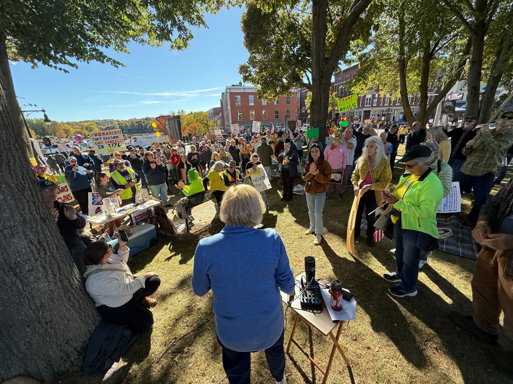 Ann Oskam of Auburn, a senior citizen and special education teacher, said she is worried about the Trump administration’s cuts to education funding and health care, including Medicare Advantage. “It’s open enrollment. Half the plans are gone,” she said. “It’s a scary time.”