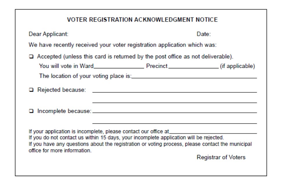 “We have recently received your voter registration,” the form reads. It then indicates whether the registration was accepted, rejected or marked incomplete.