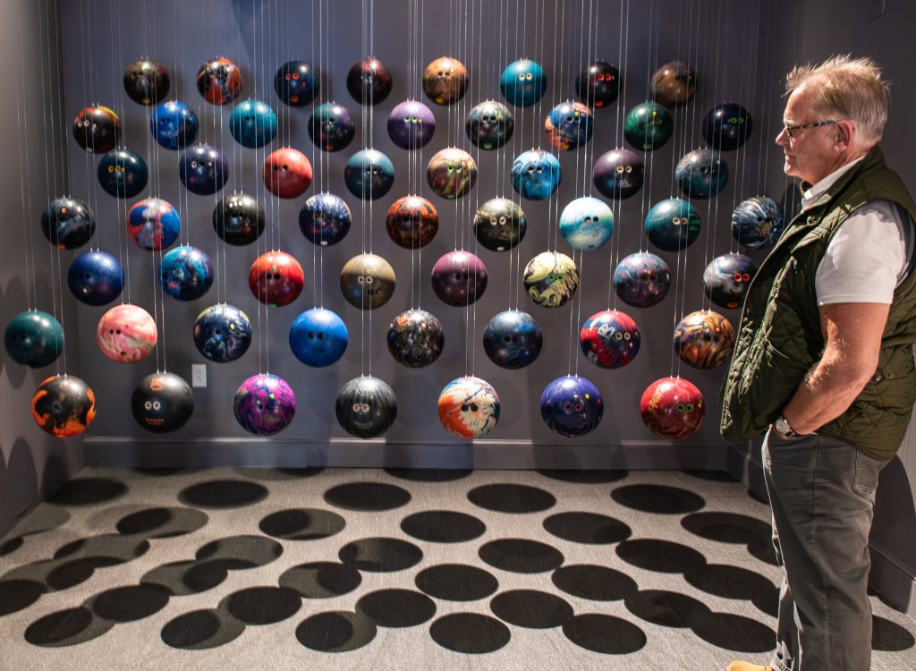 The bowling ball finger holes are faced forward, like eyes peering back at those viewing the installation — somewhat like spectators themselves staring back at people, he said.