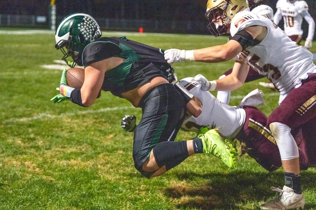 Gardiner’s Justin Doody dives for extra yardage during the Tigers' game against Cony. (Anna Chadwick/Staff Photographer)