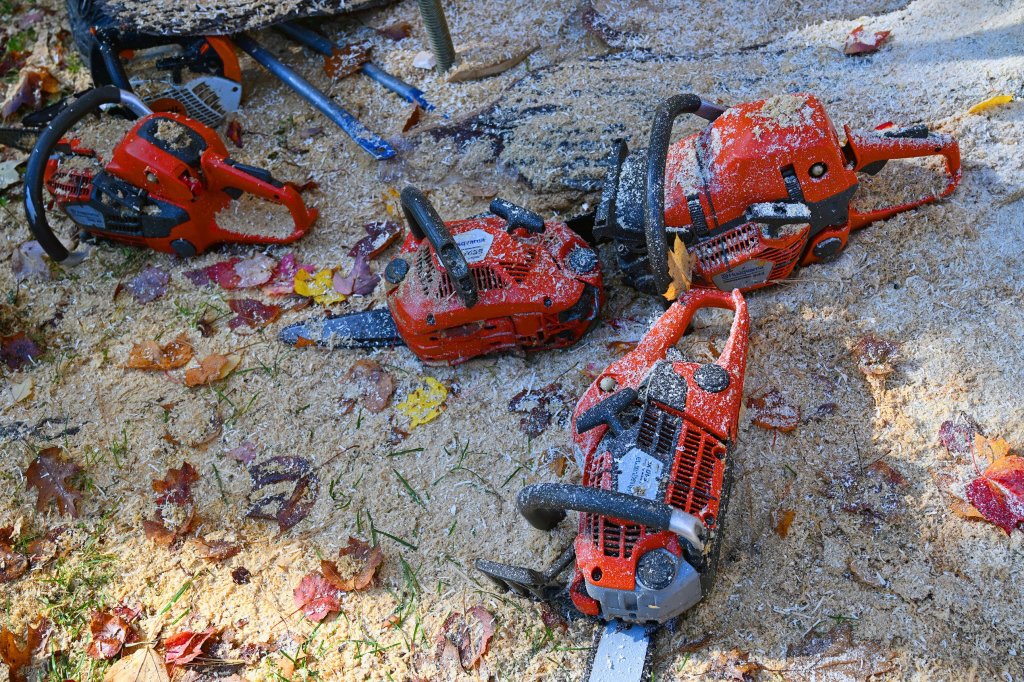 And his tools have become an extension of him. He owns 40 chainsaws, and he swears he’s not on any sort of watchlist because of it. For a typical job, he brings 10 to 12 saws, but he regularly reaches for the same seven.