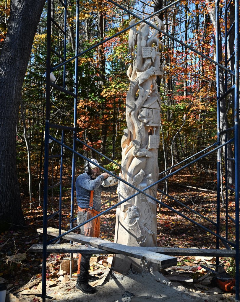 When Landry arrived at Cardamone’s property on Oct. 15, he started by setting up his metal staging and stripping the bark from the tree, revealing the yellowish raw wood. It usually takes him two weeks to make his tree-stump sculptures, and he said that the first couple of days are pretty slow.