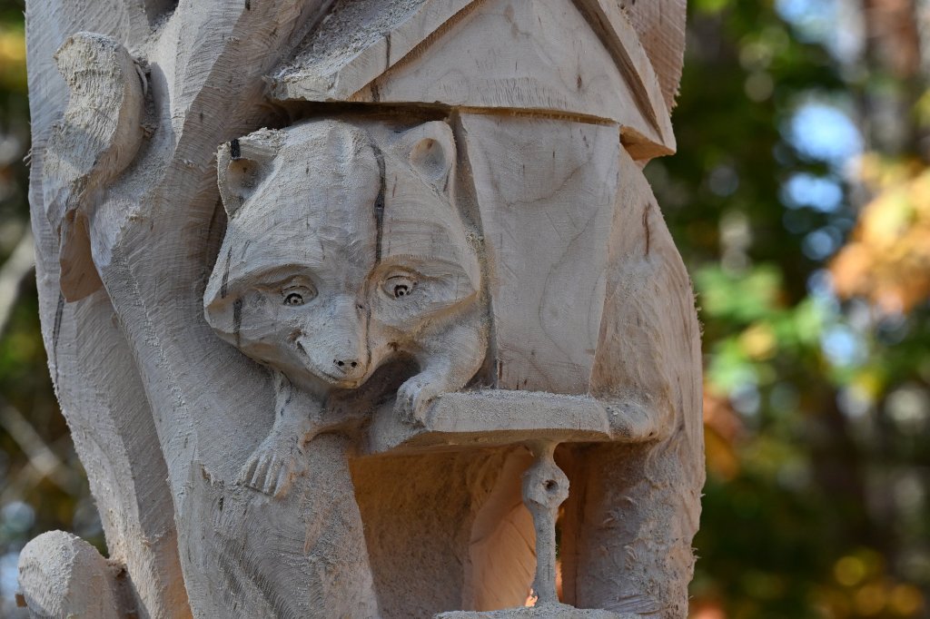 For this project, for example, Cardamone said she wanted the piece to be inspired by her love of birds. A crow wasn’t in the original plan, but when one perched on the staging area while Landry was carving, it made its way into the sculpture. Same with a raccoon with a mischievous expression eyeing the carved birdfeeder.