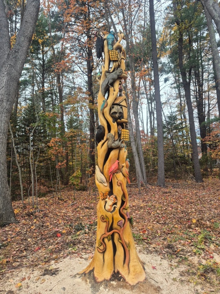 A few years ago, he transformed a dead ash tree in Stephen King’s front yard into a bookshelf with critters huddled in the shelves and carved birds perched in the sculpted branches. People came and watched as he carved. “I tried to not let the pressure get to me,” he said.