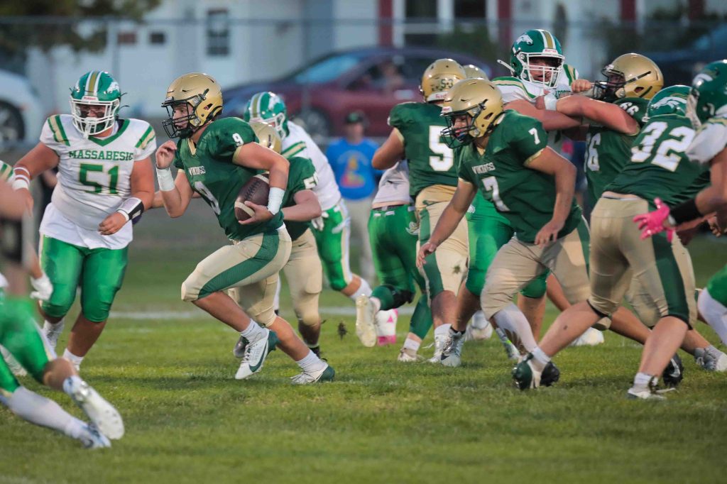 Oxford Hills’ Dylan Truman breaks into the secondary against Massabesic. (Brewster Burns photo)