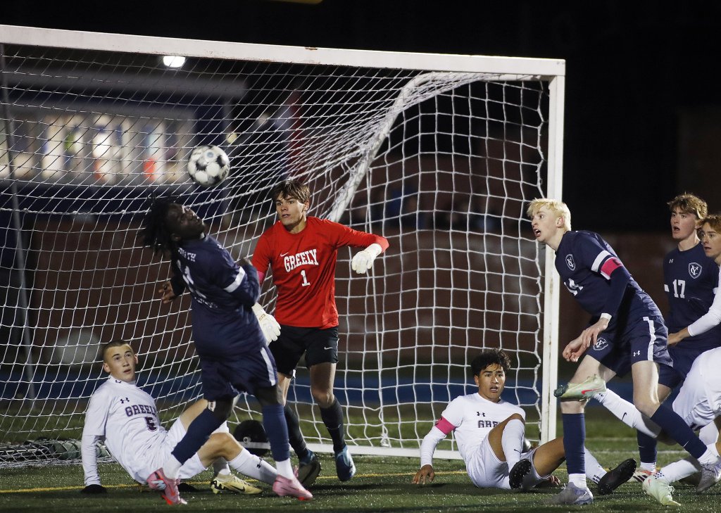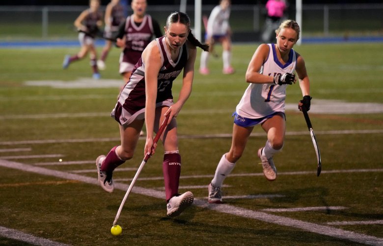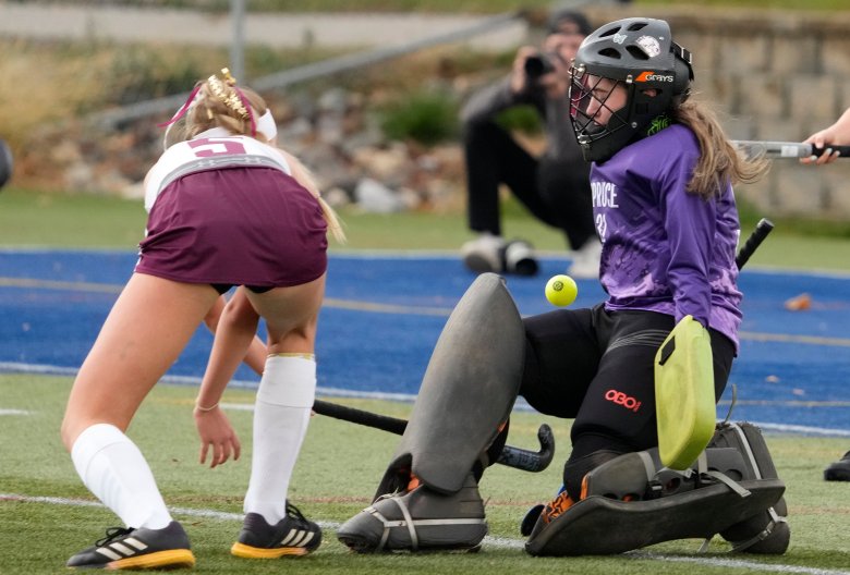 Greely defenders and goalie Landon Dominski watch as the ball skims past Yarmouth’s Zacarias Binda in the first overtime Thursday. Binda eventually scored in the second overtime, giving Yarmouth a 2-1 victory. (Derek Davis/Staff Photographer)Joey Pompeo of Cheverus battles for the ball with Biddeford’s Mia Mariello. Cheverus beat Biddeford 3-2 in overtime to win the Class A South field hockey final on Thursday in Yarmouth. (Shawn Patrick Ouellette/Staff Photographer)Freeport senior captain Lizalyn Boudreau dribbles between Yarmouth’s Celia Zinman, left, and Maya Nasveschuk. The Falcons beat Yarmouth, 1-0, to win the Class B South field hockey title on Thursday in Yarmouth. (Daryn Slover/Staff Photographer)Mt. Ararat’s Abi Tidwell, center, and Skowhegan’s Lillian Smith battle for the ball. Skowhegan beat Mt. Ararat, 3-0, in the Class A North field hockey final on Thursday in Hampden. (Rich Abrahamson/Staff Photographer)Telstar goalie Adam Stephenson jumps to make a save during the eight-person boys soccer South regional final against Pine Tree Academy on Thursday in Gardiner. Stephenson didn’t allow a goal as the Rebels beat the Breakers 1-0 in double overtime. (Libby Kamrowski Kenny/Staff Photographer)