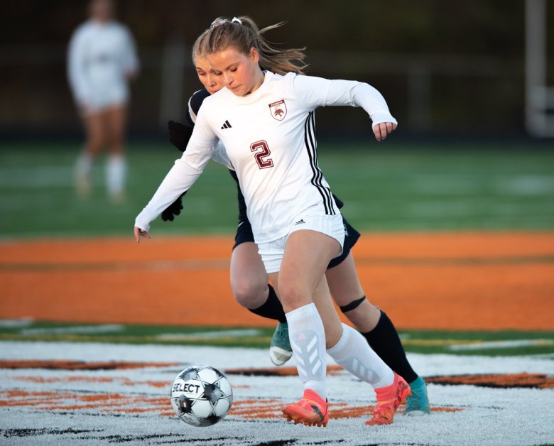 Fort Kent's Avery Werntgten traps the ball while Maranacook's Eve Simcock flinches. (Libby Kamrowski Kenny/Staff Photographer)