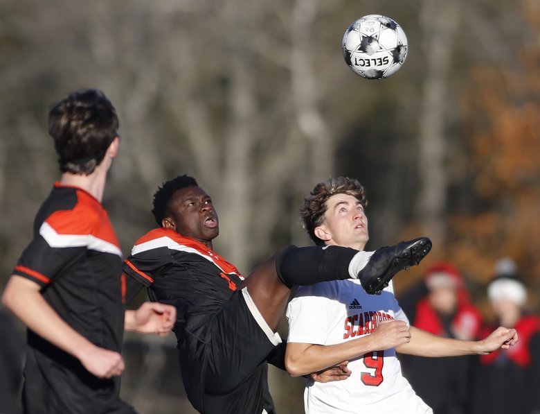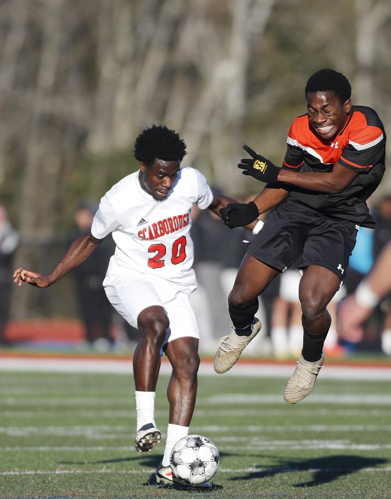 Joelson Malongo of Brunswick touches the ball away from Denver Bachman of Scarborough. (Derek Davis/Staff Photographer)