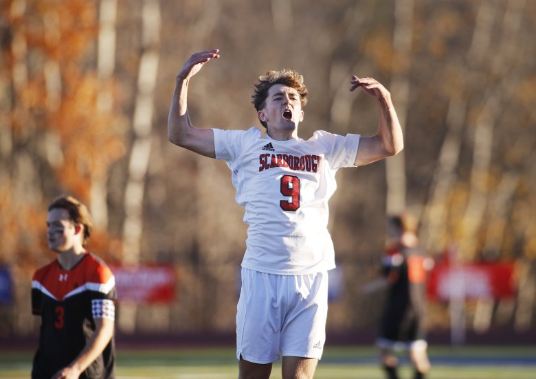 Scarborough's Denver Bachman celebrates after scoring late in the game to give the Red Storm a 2-1 lead. (Derek Davis/Staff Photographer)