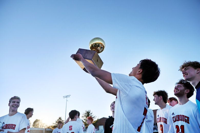 Scarborough’s Denver Bachman kisses the Gold Ball after the Red Storm beat Brunswick 2-1 to win the Class A boys soccer title on Saturday in Oakland. (Derek Davis/Staff Photographer)