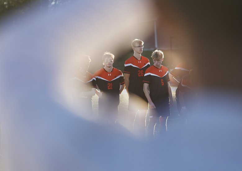 Brunswick players wait to receive the runners-up trophy after losing to Scarborough 2-1 in the Class A boys soccer state championship game. (Derek Davis/Staff Photographer)