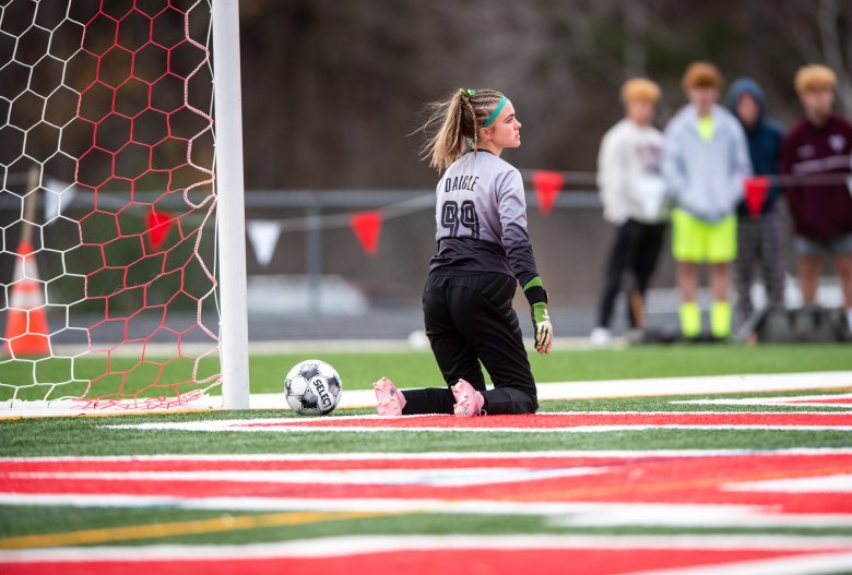 Fort Kent goalkeeper Trinity Daigle makes a save inches from the goal line. (Libby Kamrowski Kenny/Staff Photographer)