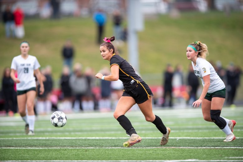 Richmond's Brooke Fournier controls the ball in the last ray of sun hitting the field. (Libby Kamrowski Kenny/Staff Photographer)