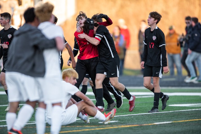 Hall-Dale goalkeeper Landon Gilbert hugs Karter Eldridge, who scored the game-winning goal in Hall-Dale's 1-0 win. (Libby Kamrowski Kenny/Staff Photographer)